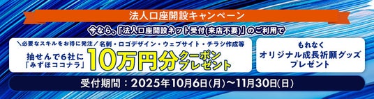 株式会社みずほ銀行(頭取:加藤 勝彦、以下:みずほ銀行)は、「ともに挑む。ともに実る。」というパーパスのもと、創業期の企業に欠かせないビジネスパートナーをめざし、多彩なサービスやお得に利用できる特典を提供しています。そしてこのたび「創業応援ラインアップ」に「最短翌営業日に口座開設」、「Mizuho Business GOLD Cardご入会特典」を追加しました。これを記念し、10月6日(月)から11月30日(日)まで「法人口座開設キャンペーン」を開催します。
