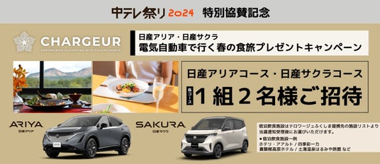 福島日産自動車株式会社(以下福島日産と略、本社:福島県福島市、代表:金子 與志幸)は、2024年3月20日(水)から開催されている中テレ祭り2024への特別協賛記念として、「CHARGEUR(シャルジュール)電気自動車(日産アリア・日産サクラ)で行く春の食旅プレゼントキャンペーン((以下本キャンペーンと略)」の応募を中テレ祭り2024の開催初日に合わせ、20日(水)からスタートしました。本キャンペーンは福島県内にお住いの方を対象としたキャンペーンとなっており、春の食旅を楽しみながら、電気自動車への関心をもってもらうきっかけにと実施しているものです。
