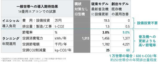 本実証では、一般世帯・高齢者施設ともに新規設備の導入は行わず既設のエアコンをそのまま活用した上で、運用改善(ナッジ配信)による節電率(9.0%)が、最新普及機への設備更新による節電率(3.8%)を上回る結果となりました。設備投資が不要であることから、1万世帯に導入した場合には年間約600t-CO2の削減効果が見込まれます。