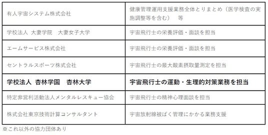 健康管理運用業務は、有人宇宙システム株式会社(JAMSS)が国立研究開発法人宇宙航空研究開発機構(JAXA)から受注した契約業務で、内容は栄養管理、運動・生理的対策、精神心理支援、放射線被ばく管理など多岐にわたるもので、各分野で高い専門性をもつ、杏林大学を含む複数の大学・企業が日本人宇宙飛行士の健康管理を総合的に支援します。