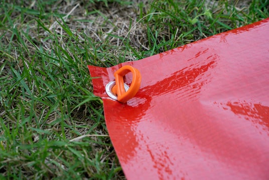 コンパスレジャーシートの四隅には、ハトメが付いており、ペグで留めることができます。方向を固定できるだけでなく、風が強いときに便利です。