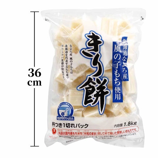 前原製粉 北海道名寄産風の子もち使用 切り餅 1.8kg日本一のもち米の産地、北海道名寄市で生産されたもち米を使用しています。粘りがあり柔らかいのが特徴の『風の子もち』米のみ100%使用で作られた切り餅です。便利な個包装パックで、特殊包材で個包装毎に賞味期限が担保されています。