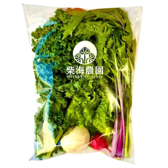 千葉県産 柴海農園 サラダセット 1袋レストランで提供されるような彩り豊かで香り高いサラダを、ご家庭でも手軽に楽しんでいただけるように作りました。ケール、わさび菜、春菊、ルッコラ、赤水菜、トレビス、赤軸ほうれん草、ミニ人参、ミニ大根など、5種類以上の野菜を使用しています。