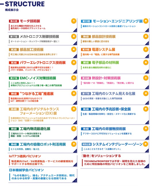 国内唯一の「モータ技術展」や「電源システム展」を有するTECHNO-FRONTIERは、全21の展示会で構成されています。そのため、専門分野だけでなく、関連業界の情報や最新技術、業界動向なども合わせてご覧いただくことができます。