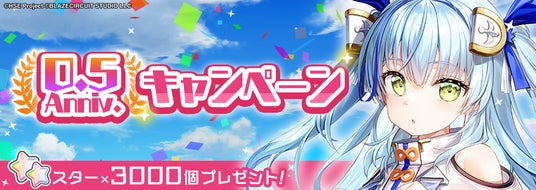 日頃、遊んでいただいている皆様に感謝を込めて「0.5Anniv.配布キャンペーン」を実施いたしました。「スター(無償)」×3000をプレゼントボックスにお送りしておりますのでぜひ、お受け取りください。