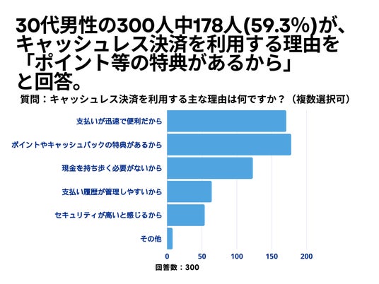 30代男性の300人を対象とした「キャッシュレス決済を利用する主な理由は何ですか?」というアンケートで178人(59.3%)が「ポイント等の特典があるから」という結果になりました。