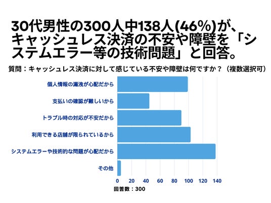 30代男性の300人を対象とした「キャッシュレス決済に対して感じている不安や障壁は何ですか?」というアンケートで138人(46%)が「システムエラー等の技術問題」という結果になりました。