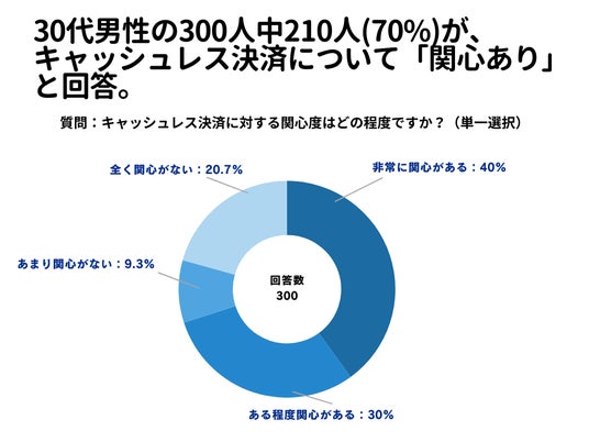 30代男性の300人を対象とした「キャッシュレス決済に対する関心度はどの程度ですか?」というアンケートで210人(70%)が「キャッシュレス決済について関心あり」という結果になりました。