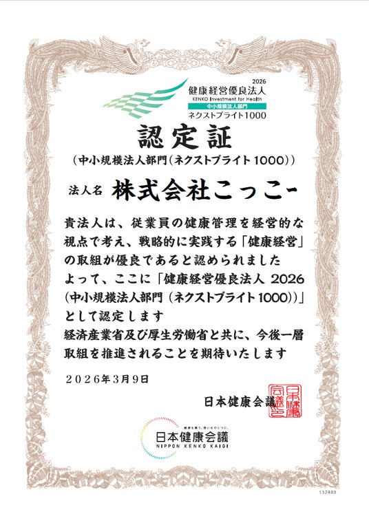 株式会社こっこー (本社:広島県呉市、代表取締役:槙岡達也、以下 当社) は、経済産業省と日本健康会議が共同で推進する「健康経営優良法人認定制度」において、新たに「健康経営優良法人2026(中小規模法人部門 ネクストブライト1000)」に認定されました。