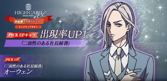 株式会社U Know Games (本社:東京都港区、代表取締役:谷口祐一郎)は、アニメ『HIGH CARD』のスマートフォン向けゲーム「HIGH CARD -Color of the Pair-」(略称:ハイカラ)にて、3月12日(水)より2月16日(日)に開催されたTVアニメ『HIGH CARD』完結記念イベント「HIGH CARD #EX SPECIAL PARTY!」をもう一度体験できる「# EX SPECIAL PARTY!」朗読劇コラボストーリーイベントを実施いたしましたので、お知らせいたします。