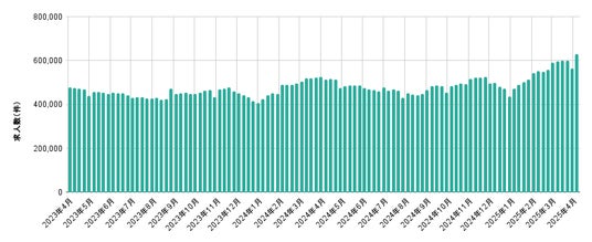 ■4月度の全国アルバイト・パート求人数は、629,732件(前月比+39,155件、前年同月比+103,970件)で前月から6.63%増加、前年同月から19.78%増加した。【図2】