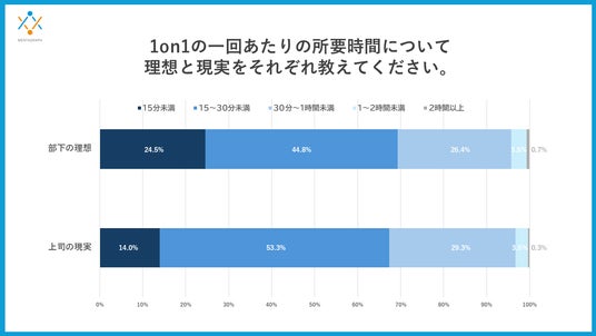 さらに、1回あたりの理想の所要時間については、部下の理想が「15分未満」24.5%という結果に。一方で上司の現実では14.0%となり、10.5ポイントのギャップがありました。対して「15~30分未満」は、上司の現実53.3%に対し、部下の理想44.8%で8.5ポイント上司の現実が上回る結果となり、部下は全体として、短時間・高密度の面談設計を支持していることがわかりました。