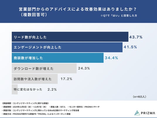 「Q10:営業部門からのアドバイスによる改善効果はありましたか?(複数回答可)」と質問したところ、『リード数が向上した(43.7%)』と回答した方が最も多く、次いで『エンゲージメントが向上した(41.5%)』『商談数が増加した(34.4%)』と続きました。
