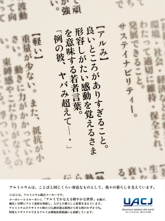 渡邉さんの作品は、課題企業の一つであるアルミニウム総合メーカー・UACJをテーマとし、辞書の紙面を模した構成で「アルミ」という言葉を若者言葉として定義したものです。一見シンプルな構成の中に、素材の魅力を感覚的に伝えるための言葉の工夫と、視覚的な仕掛けが込められています。
