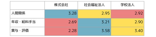本調査では、全口コミの中から50代の保育士が投稿した口コミだけを調査対象とし、20個の口コミカテゴリーごとに、保育園・幼稚園を運営する「株式会社」「社会福祉法人」「学校法人」の評価点数を比較しています。そして、「1位(青色)」「2位(黄色)」「3位(赤色)」の色付けを行い、それぞれの職場の強み・弱みといった特徴を整理しています。(参考情報として公立の保育園・幼稚園を運営する「自治体」も公開)