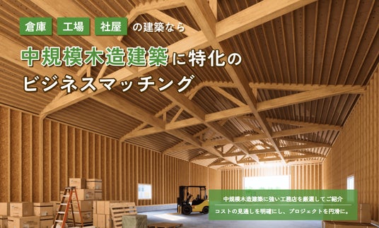 本サービスは、倉庫、工場、社屋の建築を検討されている企業様に対し、木造建築が可能な優良工務店を【無料】ご紹介いたします。