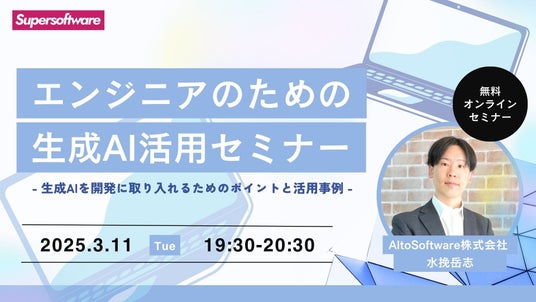 DXを推進するITパートナーとして内製化支援や開発組織構築まで一貫して行う株式会社スーパーソフトウエア 東京オフィス(所在地:東京都渋谷区、東京オフィス代表:船木俊介、以下当社)は、エンジニア向けのセミナーを開催いたします。本セミナーでは、生成AIを活用して業務を効率化する方法を学びます。AIがプログラムを実装する時代を迎える中、エンジニアに求められるスキルの変化に対応するため、実践的な生成AIの活用法をご紹介します。