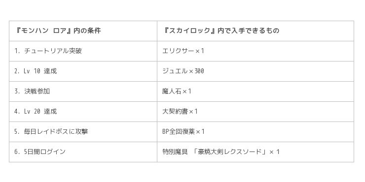 株式会社グラニ(本社:東京都港区、代表取締役社長:谷 直史、以下、グラニ)と、株式会社カプコン(本社:大阪市中央区、代表取締役社長:辻本 春弘、以下、カプコン)は、ソーシャル・ネットワーキング・サービス(SNS)「GREE」上で提供している、「モンスターハンター」シリーズのソーシャルカードゲーム『モンスターハンター ロア オブ カード』(以下『モンハン ロア』)と、株式会社gloops(本社:東京都港区、代表取締役社長:池田 秀行)の 『スカイロック』(以下『スカイロック』)と初のコラボレーションキャンペーンを実施します。