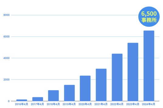 『STREAMED』の会計事務所プランをご導入いただいている公認会計士事務所、税理士事務所(以下、「会計事務所」といいます。)は、2024年4月末日時点で6,544事務所、昨年4月末に比べ約1,100事務所の増加となりました。日本の会計事務所30,479事業所※2のうち21.4%、およそ5会計事務所あたり1事務所に『STREAMED』をご導入いただいたことになります。また、国内従業員規模上位100会計事務所※3のうち約6割が『STREAMED』を導入済みとなりました。