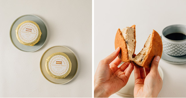 一枚一枚手作業で焼き上げる自家製クッキーは、ブルターニュ地方の厚焼きクッキー「ガレット・ブルトンヌ」をイメージした ザクザクとした食感が特徴。国産小麦そのものの豊かな甘味とたっぷり入れた国産バターの風味が楽しめ、ほんのり香るラム酒と表面にちりばめられた岩塩がアクセントに。濃厚ミルクフレーバーのアイスを贅沢にサンドした食べ応え抜群のクッキーサンドです。