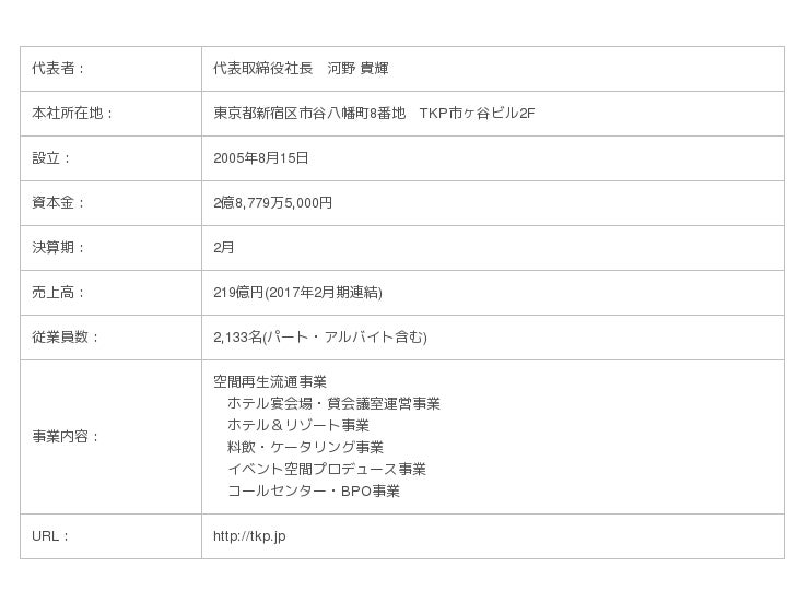 TKPは「日本の会議を良くしたい」をテーマに、各主要都市や未出店地域において、利便性の高い機能的なオフィスビルやランドマークとなるビルやホテルへの出店を積極的に進め、国内ネットワークの更なる拡充を図り、付加価値を加えた快適な「場」「空間」「時間」を創出する空間再生流通事業において、事業領域の拡大を目指します。