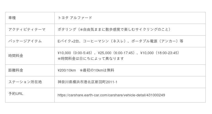 株式会社アースカー(東京都千代田区、代表取締役社長:遠藤昭二、以下:当社)のカーシェアリング事業プラットフォームの提供を受け、アルパインマーケティング株式会社(東京都大田区、代表取締役社長:石田宗樹、以下:アルパイン)は、アウトドア&アクティビティの特別な体験が味わえるアルパインプロデュースのカスタムカーとレジャーギアをパッケージしたカーシェアリングサービス『STORYCA(ストリカ)』を開始いたしました。