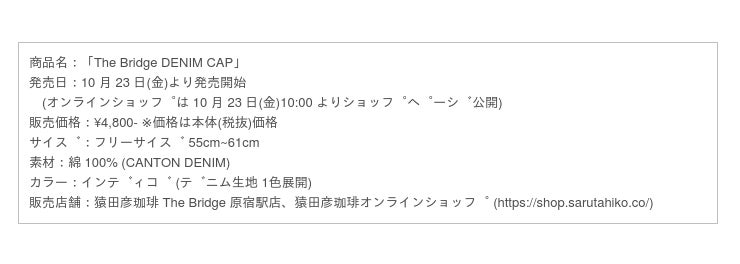 猿田彦珈琲株式会社(所在地:東京都渋谷区 代表取締役:大塚朝之)が運営する「猿田彦珈琲」では、10 月23日(金)より国産デニムを採用したオリジナルキャップ「The Bridge DENIM CAP(ザ ブリッジ デニム キャップ)」を猿田彦珈琲 The Bridge 原宿駅店、猿田彦珈琲オンラインショップにて数量限定販売いたします。
