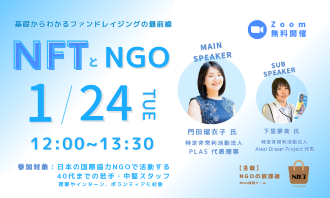 2023年1月24日(火)、日本の国際協力NGOの40代までの若手・中堅スタッフの有志であるNGOの放課後(通称Nカゴ)が、「NFTとNGO~基礎からわかるファンドレイジングの最前線~」を開催、NPO法人アラジ、代表理事の下里夢美がスピーカーとして登壇します。