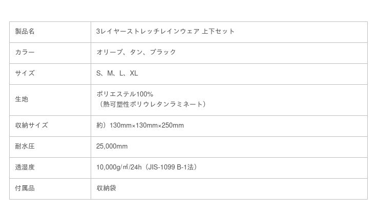 《「3レイヤーストレッチレインウェア 上下セット」の基本情報》