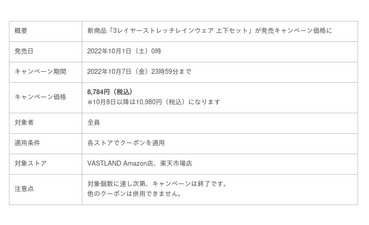 VASTLAND株式会社(本社:兵庫県姫路市/代表:田中悠貴)は、3レイヤー構造を採用し、高い防水性と透湿性を両立した「3レイヤーストレッチレインウェア 上下セット」を2022年10月1日(土)にAmazon店&楽天市場店で先行発売することを決定しました。また発売を記念して、Amazon店&楽天市場店限定で「発売キャンペーン」を開催します。