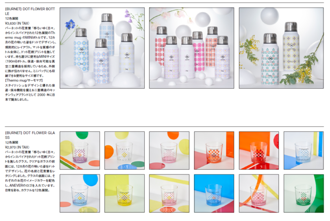 「一瞬(A NEVER)」と「永遠(AN EVER)」という対極の時間を共存させたブランド名『ANEVER』。今回発表した新作は、12ヵ月の花と花言葉を纏うBURNET(バーネット)シリーズ第2弾。バーネットの花言葉「移ろいゆく日々」からインスパイアされた、『ANEVER』初となる香水、グラス、フーディー、キャンバストートの4アイテムのほか、Tシャツやソックス、Thermo mugとのコラボボトルなどを発表します。12ヵ月の花をドットで表現し、自然とデジタル、相反する世界をひとつにデザイン。花を抽象化しドットで描いたことで、自然界の花とデジタルの交錯する世界が生まれました。対極にあるふたつをひとつにすることは、「一瞬=A NEVER」と「永遠=ANEVER」をブランド名『ANEVER』の中に共存させたように設立時から大切にしているテーマです。