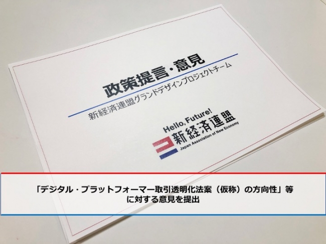 一般社団法人 新経済連盟(所在地:東京都港区、代表理事:三木谷浩史、以下「新経連」)は、2020年1月20日、内閣官房デジタル市場競争本部事務局が意見募集していた「デジタル・プラットフォーマー取引透明化法案(仮称)の方向性」に対して、意見を提出しました。本意見については、2019年12月20日付で公表したコメントと同内容をパブリックコメントの手続きとしても提出したものです。
