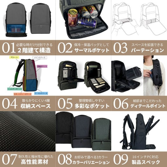 - 荷物を分けたい時だけ使える!保冷保温機能を完備し、お弁当はもちろん濡れた物も簡単に分別収納。