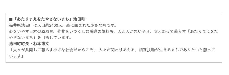 福井県池田町は人口約2400人、森に囲まれた小さな町です。心をいやす日本の原風景、作物をいつくしむ感謝の気持ち、人と人が思いやり、支えあって暮らす「あたりまえをたやさないまち」を目指しています。