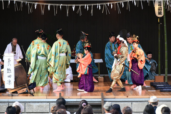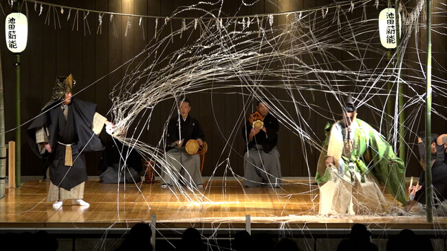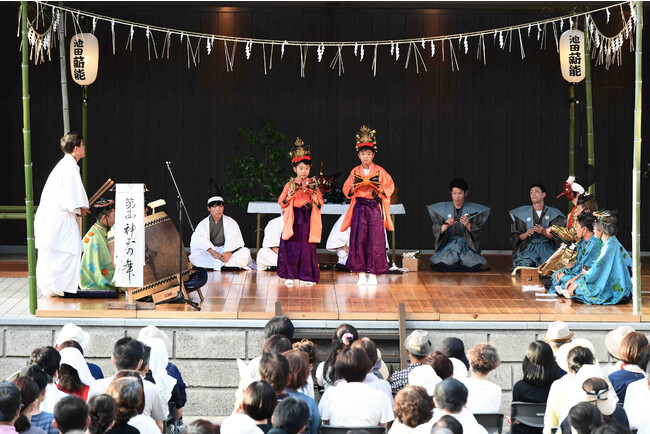 薪能は、鎌倉時代に奈良の興福寺で始まったとされており、能舞台の周囲にかがり火を焚いて演じる能楽です。池田町では23年ぶりに薪能を復活。水海の田楽能舞に加え、池田町と同じく、農村の営みのなかで受け継がれてきた愛知県新城市の国の重要無形文化財「鳳来寺田楽」の演舞が披露されました。
