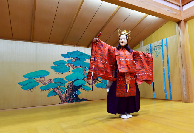 重要無形文化財総合認定保持者であり、2017年芸術選奨文部科学大臣賞受賞、2018年紫綬褒章を受章されている能楽金剛流二十六世宗家金剛永謹氏による金剛流能が披露されました。「越前池田 能楽の里が選ぶ能面展 全国新作能面公募展」で、第12回で最優秀作品に選ばれた大阪府・松本幸男さん作「顰」、第18回で最優秀作品賞に選ばれた岡山県・白神元治さん作「小面」が使用されました。
