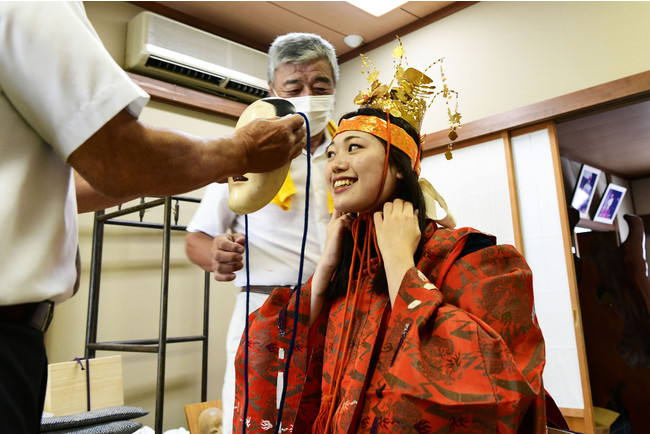 日没が近づいた第二部のはじめに「火入れ式」が執り行われました。地元の中学生宮本藍歌(3年生)さん、山内温(3年生)さんが巫女をにない国の重要文化財に指定されている須波阿湏疑神社本殿から種火を受け取り、厳粛な雰囲気の中、舞台のかがり火に灯りをともしました。