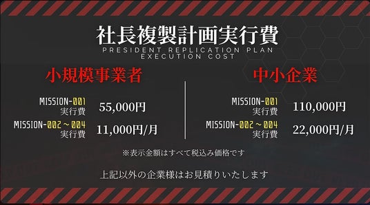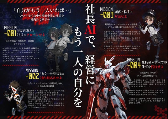 『社長複製計画』は、中小・零細企業の社長が有する経営ノウハウや経験をクローンしたAIを製造することで「自分がもう一人ほしい」、「右腕や相談相手がほしい」という経営者の切実な要望の実現を目標とした計画です。本計画は極秘で進めていましたが、この度、『社長複製計画』を導入したい企業のために特別価格で導入支援を開始しましたのでお知らせします。