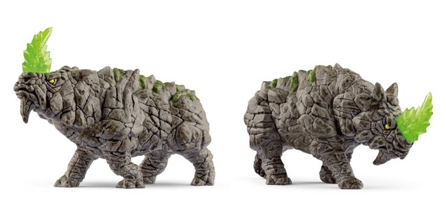 「戦うサイ」という意味の『バトルリノ』。背中は硬い岩の甲羅に守られ、長い年月をバトルに費やしてきたことをうかがわせるような苔も生えています。頭を上下に動かすことができるので、クリスタルグリーンの角を敵に向かって突き倒すバトル遊びができます。