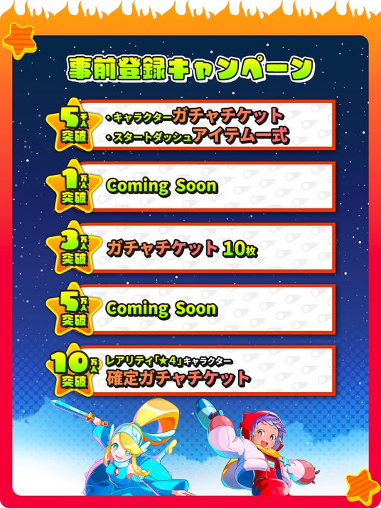 事前登録いただいた件数に応じて、ゲームリリース時に素敵な特典を全プレイヤーへプレゼントさせて頂くキャンペーンを実施中です。更に今後、公式Xでもプレゼントキャンペーンを実施予定です。ぜひ公式Xをフォローの上ご参加ください。
