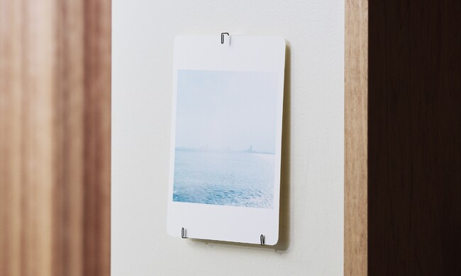 カードやリーフレットなどは下に2つ、上に1つ使用することで穴をあけずに支えられます。