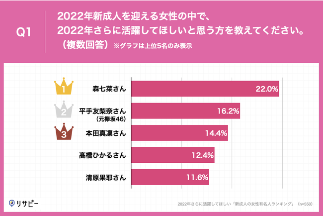 「Q1.2022年新成人を迎える女性の中で、2022年さらに活躍してほしいと思う方を教えてください。(複数回答)」(n=550)と質問したところ、「森七菜さん」が22.0%、「平手友梨奈さん(元欅坂46)」が16.2%、「本田真凜さん」が14.4%という回答となりました。