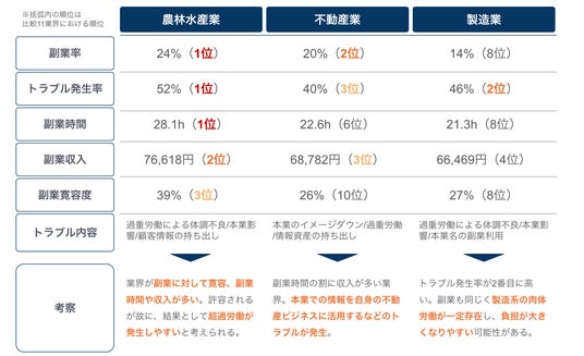 副業率が最も高い農林水産業は、トラブル発生率、副業時間でもトップという結果だった。業界が副業に対して寛容、副業時間や収入が多い。許容されるが故に、結果として超過労働が発生しやすいと考えられる。不動産業界は、副業時間の割に収入が多い業界である一方、本業での情報を自身の不動産ビジネスに活用するなどのトラブルが発生する傾向にある。次に、製造業はトラブル発生率が2番目に高い。副業も同じく製造系の肉体労働が一定存在し、負担が大きくなりやすい可能性がある。