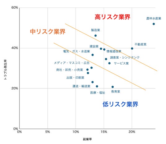 「副業率」、「トラブル発生率」の2軸をかけ合わせると、高リスク業界、中リスク業界、低リスク業界に分類が可能。