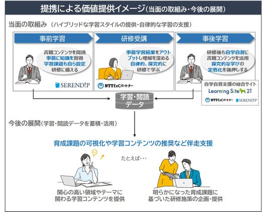こうした状況を踏まえ、本取組みでは、NTT ExCパートナーが企画・提供する教育研修プログラムに、学びの広さと深さの両面を持たせるツールのひとつとしてSERENDIPのコンテンツを組み込み、反転学習や前後学習などのハイブリッドな学習スタイルを実現することが可能となります。本取組みにより、従来の均一教材によるインプットに加え、受講者の自律的な学び意欲の喚起、研修における理解度の向上、受講後の探究的な学びの継続・定着化が期待されます。
