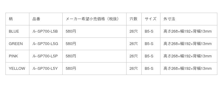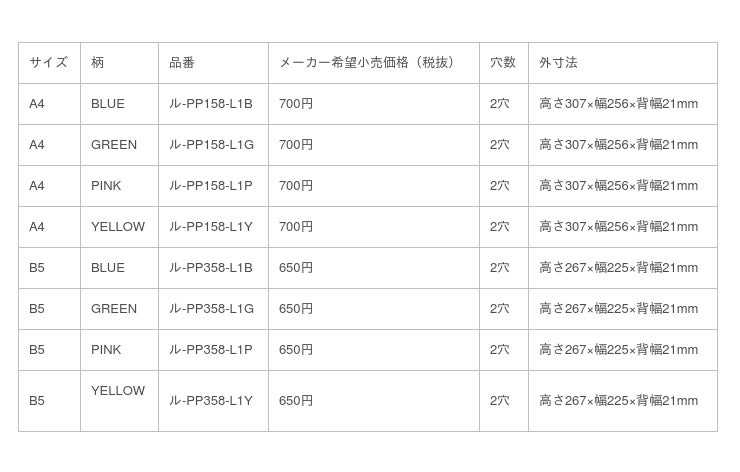 ●表紙/R-PP ●最大収容枚数/100枚 ●寸法中の背幅はとじ具を含みます。●セット内容/ A4サイズ:中紙(B5サイズ)10枚・PP製カラー見出しシート(A4サイズ)5枚 B5サイズ:中紙(B5サイズ)10枚・PP製カラー見出しシート(B5サイズ)5枚 ●中紙/ノ-836BTN
