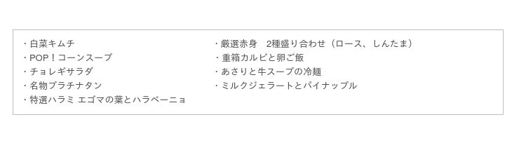 極薄切りのプラチナタン、エゴマ葉に巻いて食べるハラミ、赤身肉2種の盛合せ、焼きカルビ牛丼など、趣向を凝らしたバリエーション豊かな焼肉と、アサリがたっぷりと入った牛スープの冷麺をご堪能いただけます。