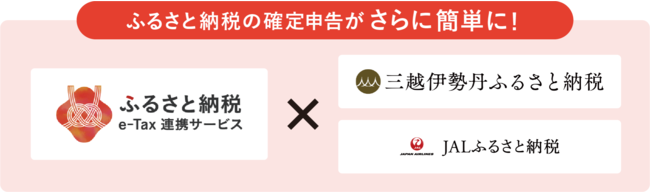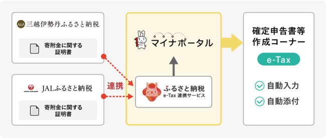 「三越伊勢丹ふるさと納税」「JALふるさと納税」でおこなった寄附の「寄附金控除に関する証明書」を、ふるさと納税e-Tax連携サービスに連携することで、e-Tax「確定申告作成コーナー」において、自動入力、自動添付することが可能になります。また「寄附金控除に関する証明書」の電子データを原本としてe-Taxに連携するため、書類保管が不要となります。