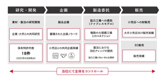 当社の特徴は大きく2点あります。1点目はファブレスモデルを採用している点です。当社は自社工場をもたず、主に海外の協力工場に製造委託をしております。製品の設計や製造工程の開発に関しては当社が担っており、詳細にわたって協力工場に指示をすることで品質を保証しつつ大量生産を可能としております。2点目はファブレスモデルを活かしつつ、研究・開発から、企画、製造委託、販売までの商流を一気通貫でマネジメントしている点です。これにより消費者のニーズを踏まえた機動的な生産に対応できる体制を整えております。