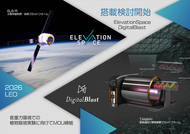 株式会社ElevationSpace(本社:宮城県仙台市、代表取締役CEO:小林稜平、以下ElevationSpace)と、株式会社DigitalBlast(本社:東京都千代田区、代表取締役CEO:堀口真吾、以下DigitalBlast)は、DigitalBlastが開発する重力発生装置「TAMAKI」を用いた植物栽培実験環境を提供するため、ElevationSpaceが開発・提供する小型宇宙利用・回収プラットフォームのサービス機「ELS-R1000」の利用に向けた検討に関する合意書(Memorandum Of Understanding、以下MOU)を締結したことをお知らせいたします。